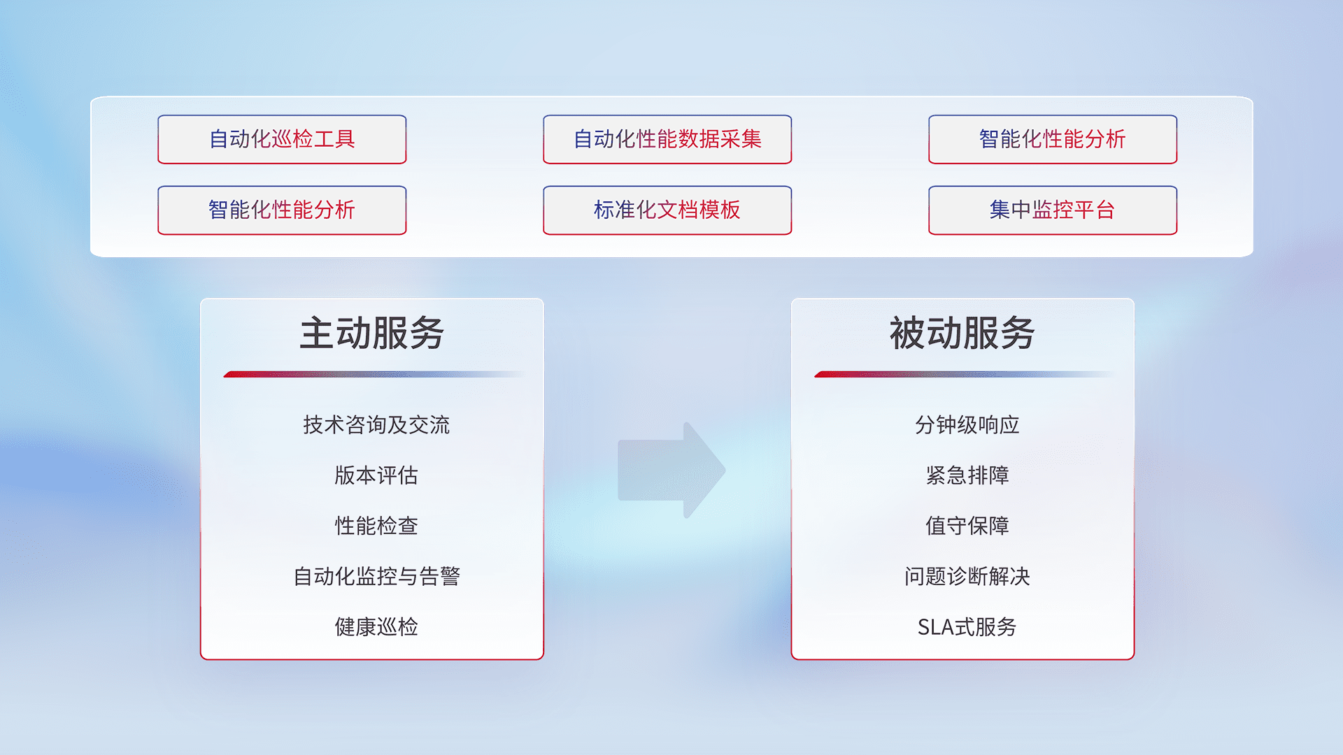 智能化工具和标准化文档,,保障服务质量,,,,提供主动服务(包含技术咨询、、、版本评估、、、、性能检查、、、、自动化监控与告警、、健康巡检)和被动服务包含(分钟级响应、、、、紧急排障、、值守保障、、问题诊断解决、、、、SLA服务)。。。。